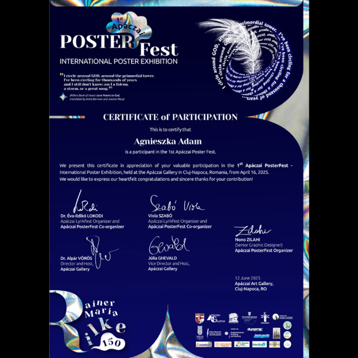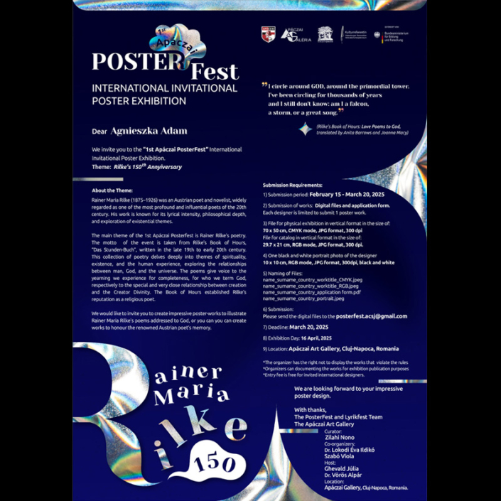 - International Invitational Poster Exhibition 1st Apaczai Poster Fest ‘Rilke’s 150th Anniversary’ – Apaczai Art Gallery, opening 16.04.2025, Cluj-Napoca, ROMANIA