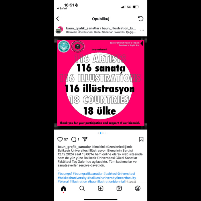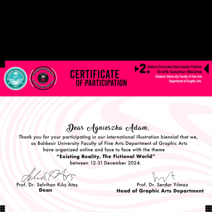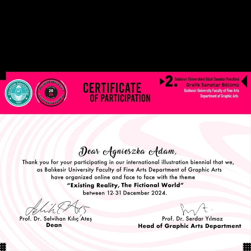 - Balikesir University International Illustration Biennial ‘Existing Reality / The Fictional World’ – Balikesir University Faculty of Fine Arts, Department of Graphic Arts, 12-31.12.2024, Balikesir, TURKEY