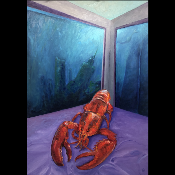 ’GLOBAL WARMING’ painting is a vision of the future world, where following the global flooding crustaceans are the only leaving creatures. Bred at homes terrariums for their looks or marine farms for tastes the precious creatures become unlikely beneficiaries of mother nature change of heart.