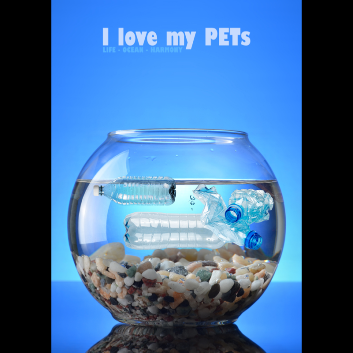 'I LOVE MY PETs’ poster, created in 2024 as an ecological poster concerning extensive amount of plastic waste destroying marine ecosystems.