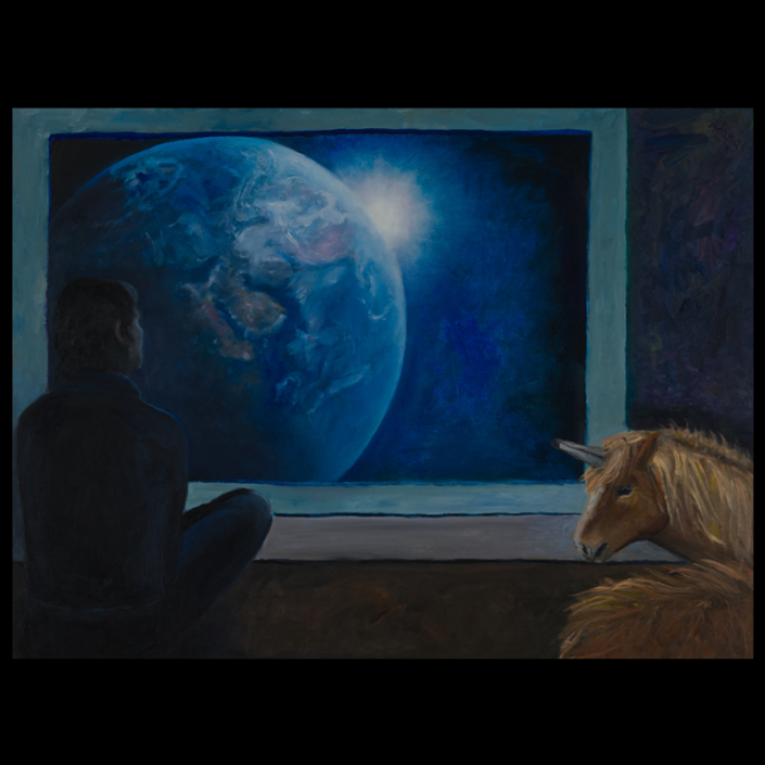 ’SELF-PORTRAIT WITH TOMEK’ painting is a tribute to the artist’s sweetheart husband constantly searching for some video content to downoload from the web.