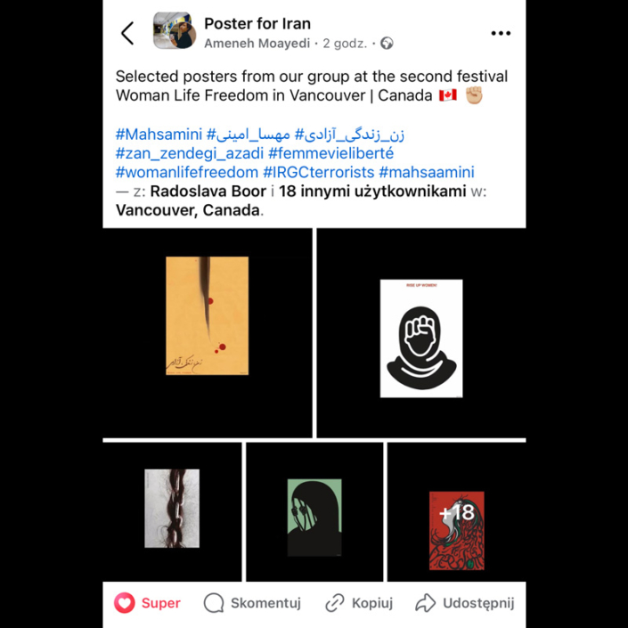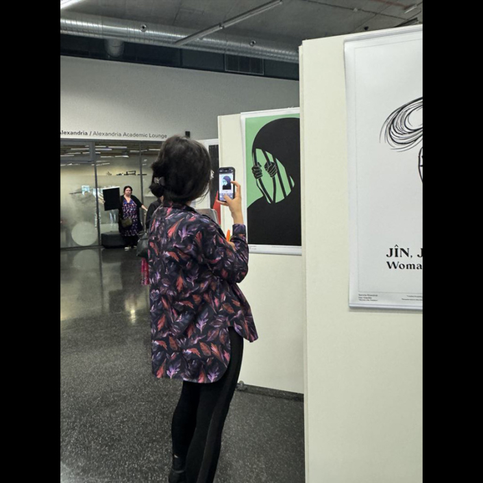 The poster had been presented in many exhibitions worlwide. It supports the women rights movements such as 'Woman, Life, Freedom’ within Poster for Iran.