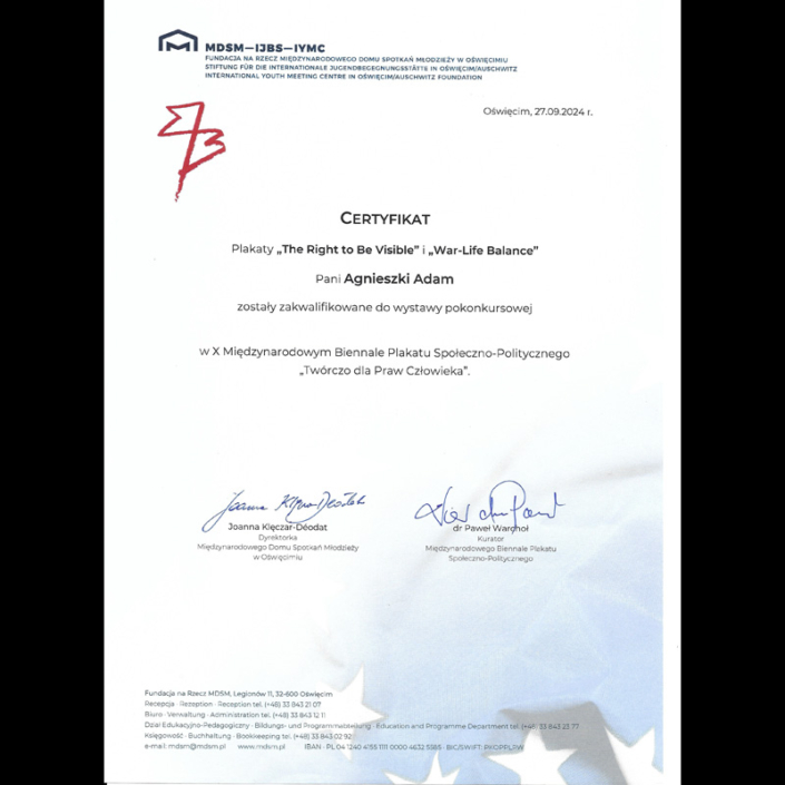 Certificate – 10th International Socio-Political Poster Biennale ‘Creative for Human Rights’ 2024, Poland