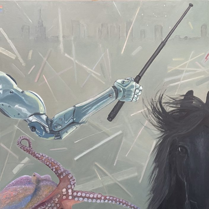 ‘THE STRIKE’ oil on canvas is the real time report on the turbulent moment in the nation’s history. In the run up to the crucial general election and in the climax of the war right behind the border forces of hood and evil brace themselves for the final clash.