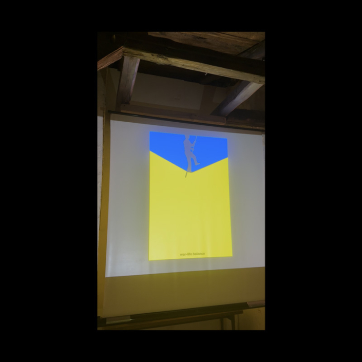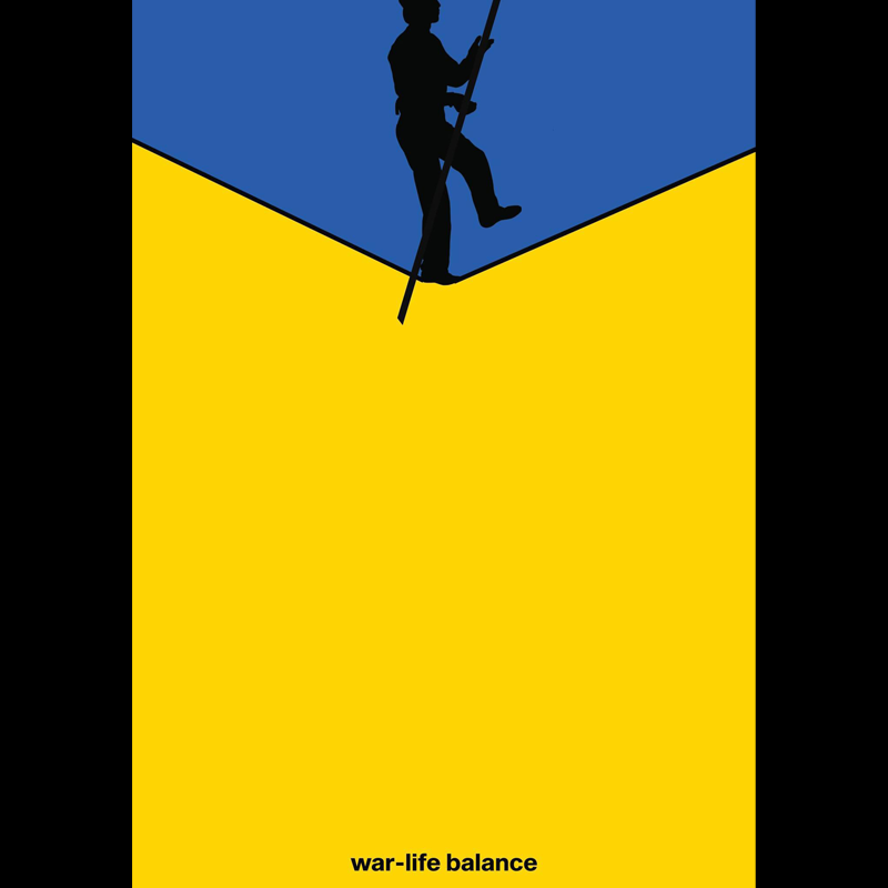 'WAR-LIFE BALANCE’ is a poster in support of the Ukrainian nation resisting the Russian invasion. Balancing the requirements of everyday life and military effort in the battlefield.